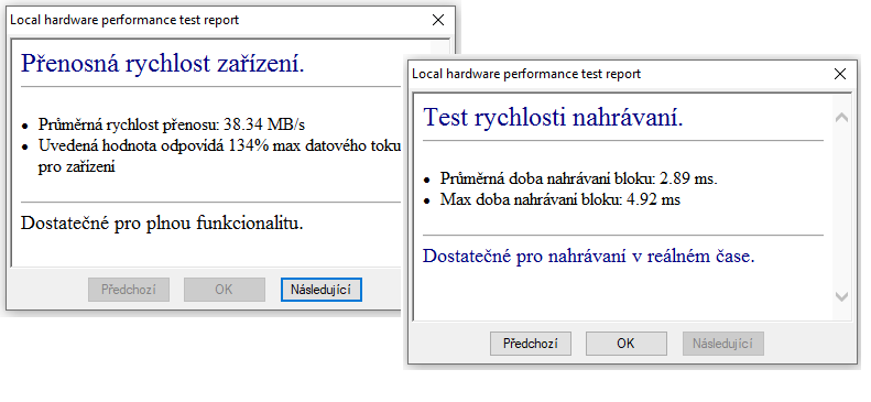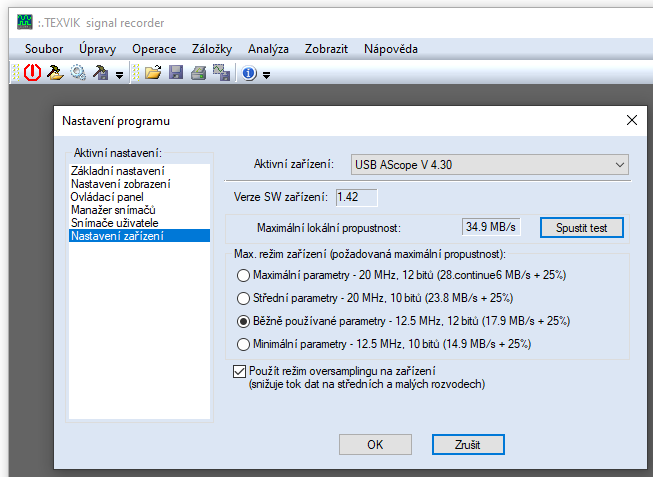 Zapnete Přístroj tlačítkem Start zařízení. Při prvním po instalací spuštění program provede test přenosové rychlosti USB a test rychlosti přenosu dat do pamětí PC.