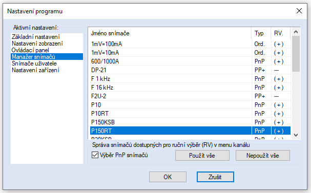 Záložka Manažer snímačů nabízí možnost definovat souhrn externích snímačů a převodníků pro zobrazení v rozbalovací nabídce kanálu.