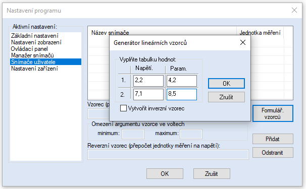 Záložka Snímače uživatele nabízí možnost přiřadit seznamu externí snímač s možnosti generaci lineárního vzorce pro následující přepočet hodnot.